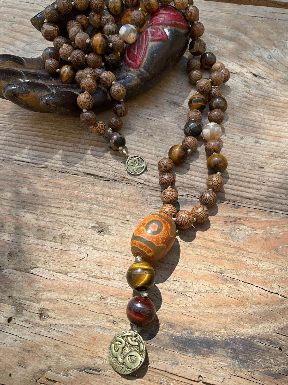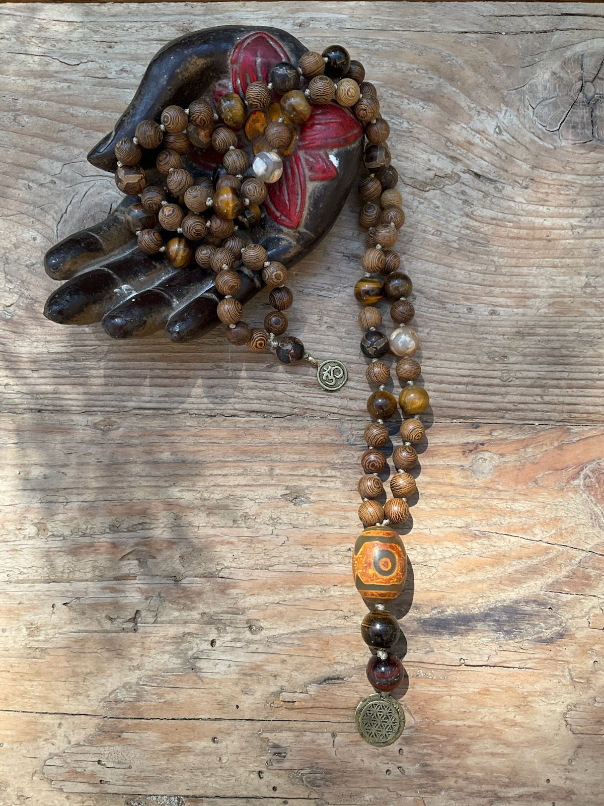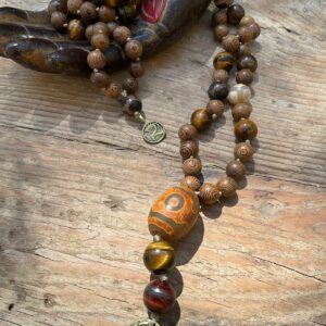 Talisman of freedom for the man who belongs everywhere and nowhere—untamed, unstoppable. Sandal wood, pyrite tiger eye mat